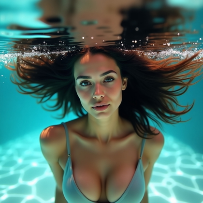 可以使用类似“minimalist one-piece swimsuit, solid color, clean silhouette”或“simple bikini, no patterns, smooth fabric”这样的提示词。避免厚重首饰、花哨图案和多层叠穿。保持色彩数量有限,黑色、白色或一种鲜明色调效果最佳。这能减少干扰,让姿势和身体线条更突出。实践中,这种风格会带来更稳定的肢体结构、更好的肤色光照,以及更少出现在边缘区域的 AI 伪影。当你想要锐利、现代的水下人像时,这是最可靠的基础风格。